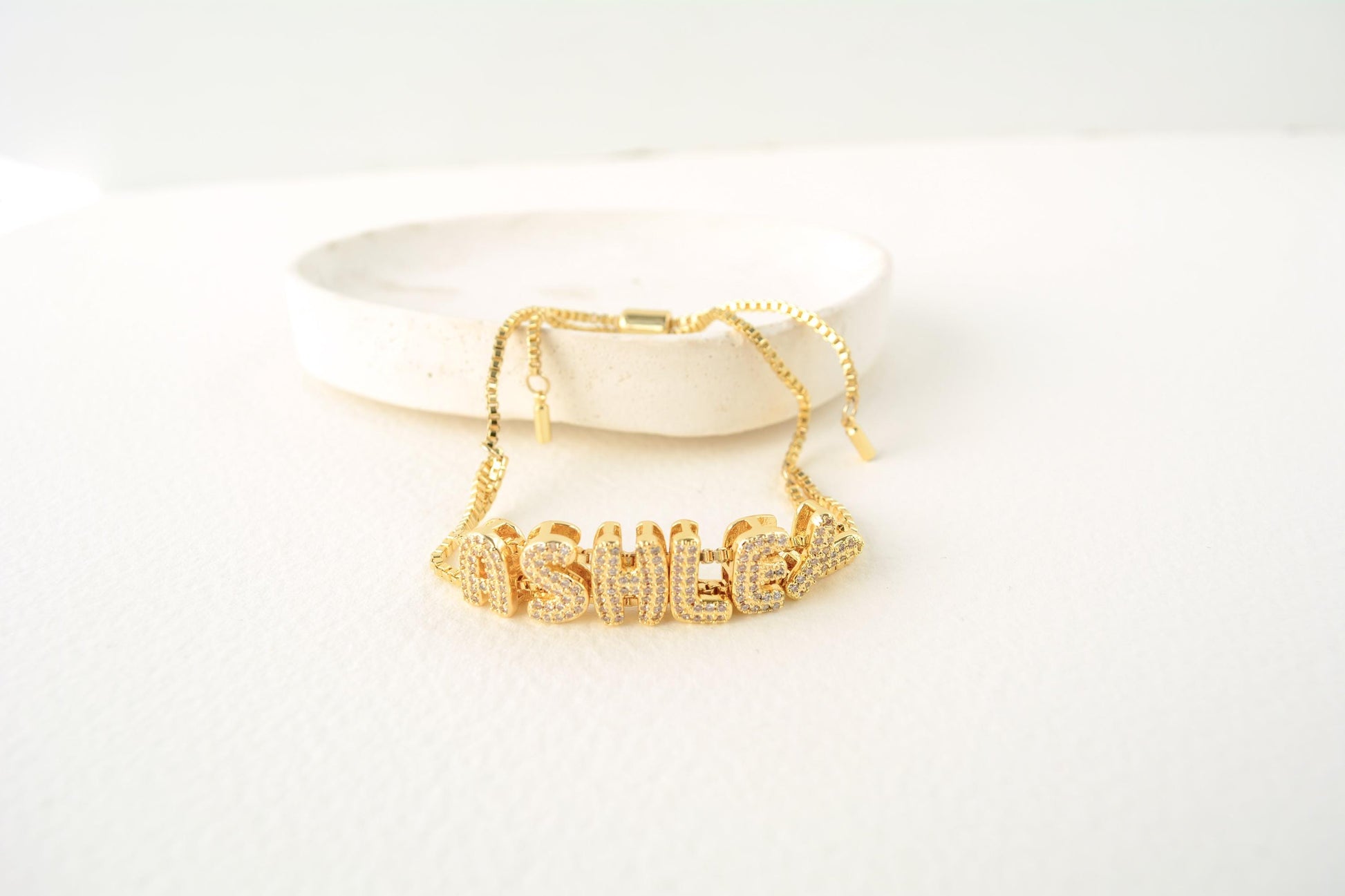 Trendy bubble letters name bracelets made as adjustable, options are available either as gold or glitter.